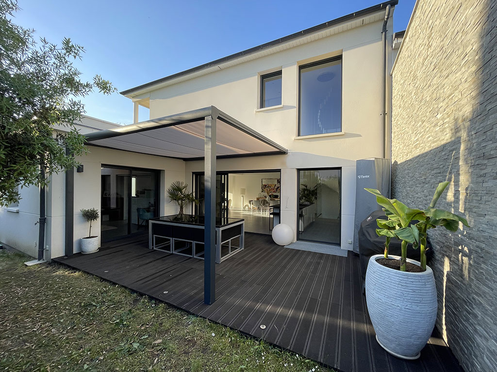 La baie vitrée donnant sur la terrasse est protégée de la surchauffe grâce à la pergola qui pourra si on le souhaite être enroulée lorsqu’il fait plus frais mais surtout en cas d’intempéries pour conserver la luminosité de son intérieur.